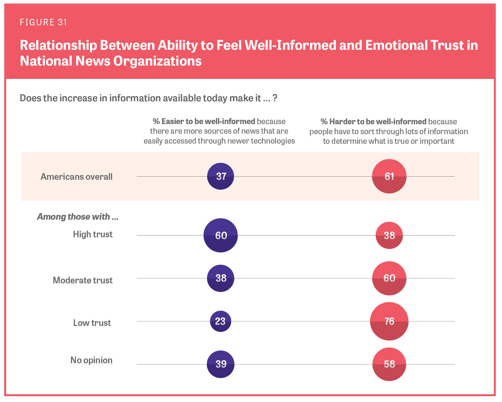 - Seventy-six percent of Americans with low emotional trust in national news organizations say the increase in information available today makes it harder to be well-informed, while 60% of those with high emotional trust in news say it makes being well-informed easier.