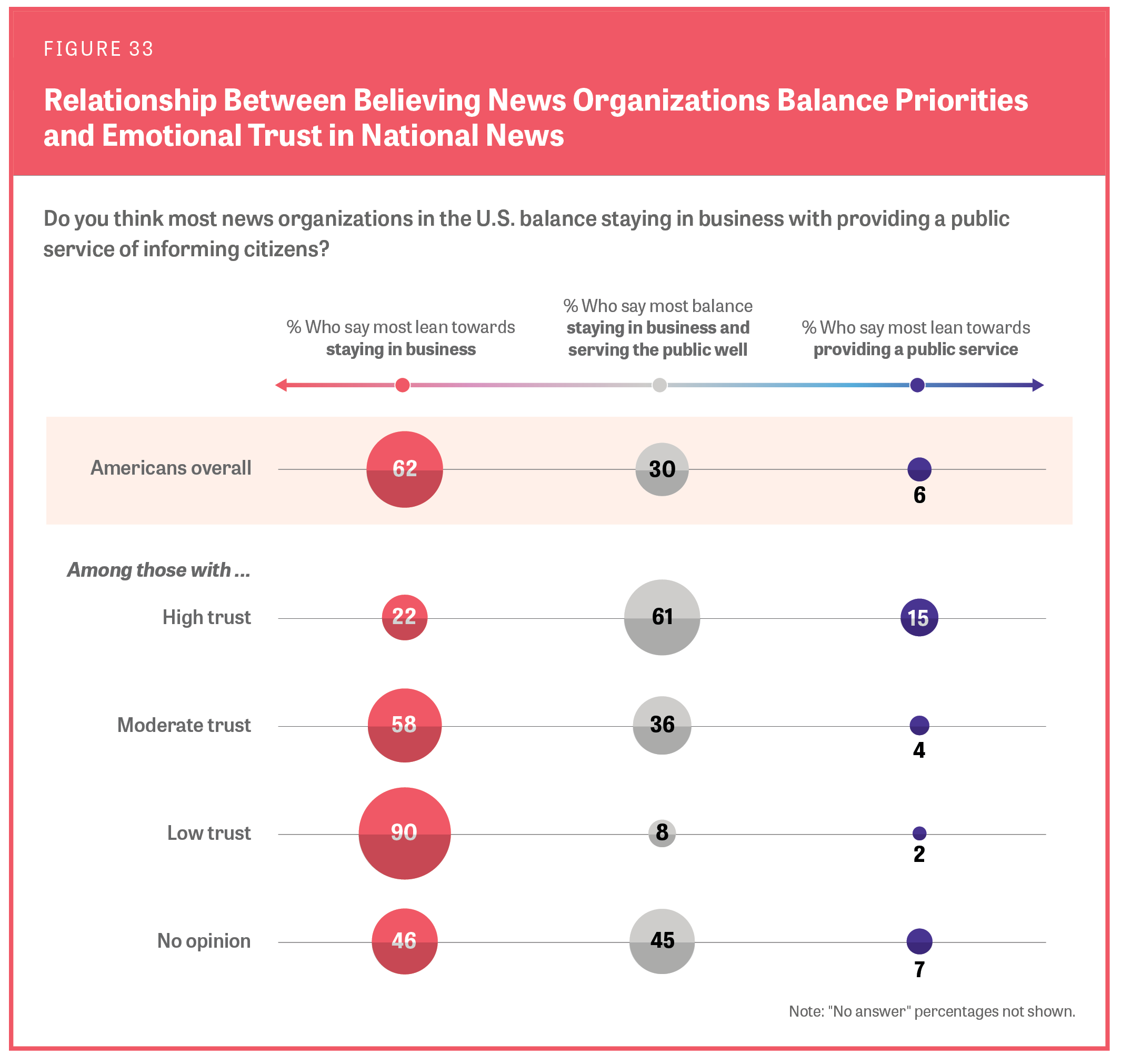 - Sixty-one percent of those with high emotional trust say most news organizations balance staying in business with serving the public well, while 22% say news organizations mainly prioritize staying in business, and 15% say they mainly prioritize providing a public service.