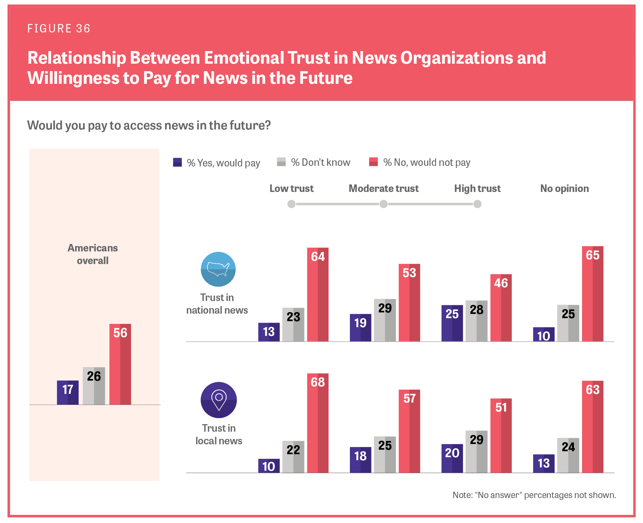 - In contrast, 23% of Americans with low emotional trust in national news have paid for news; 13% say they would pay for news in the future.