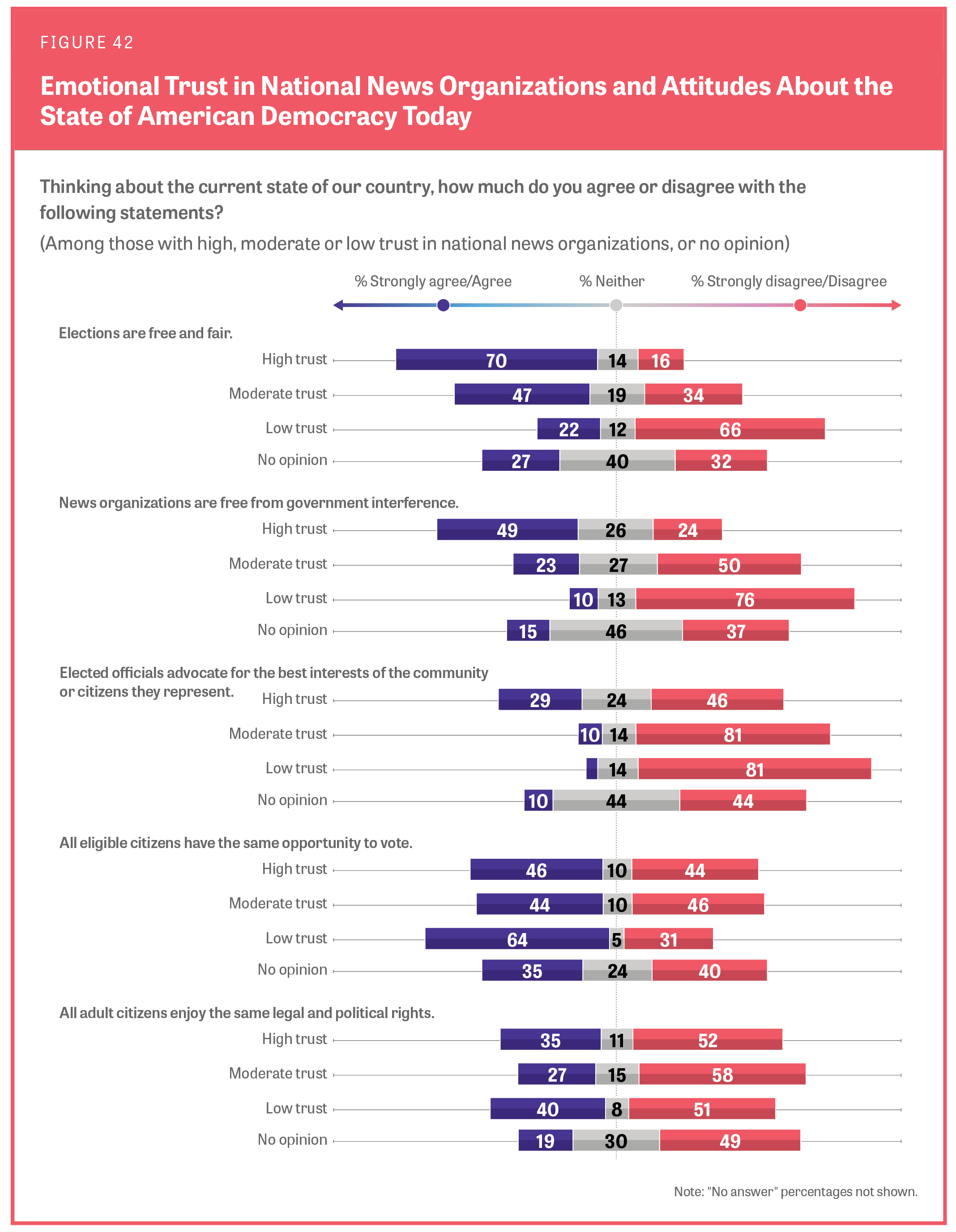 - While 70% of Americans with high emotional trust in national news organizations believe elections are free and fair, just 22% of those with low emotional trust say the same.