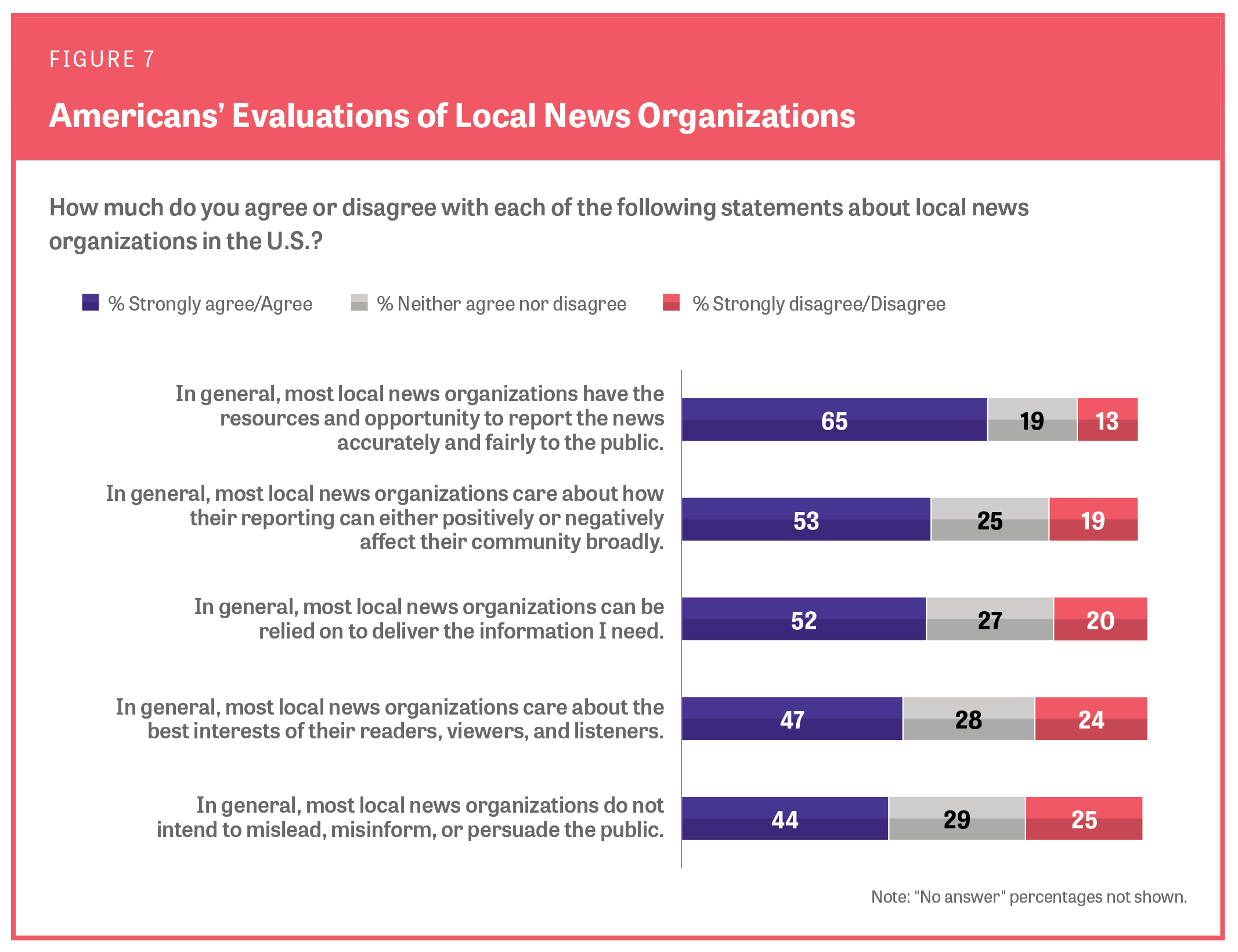 - Sixty-five percent report that local news organizations have the resources and opportunity to report the news accurately and fairly to the public, and more than half of Americans say most local news organizations can be relied on to deliver the information they need.