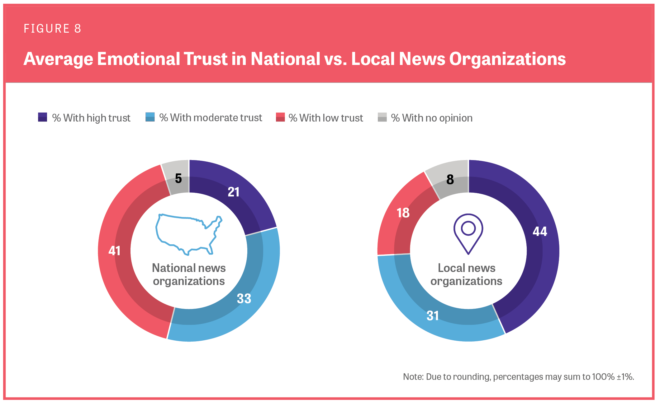 - The inverse is also true: Just 18% of Americans have low emotional trust in local news organizations, compared with 41% who have low trust in national news organizations.