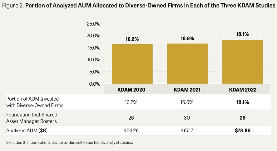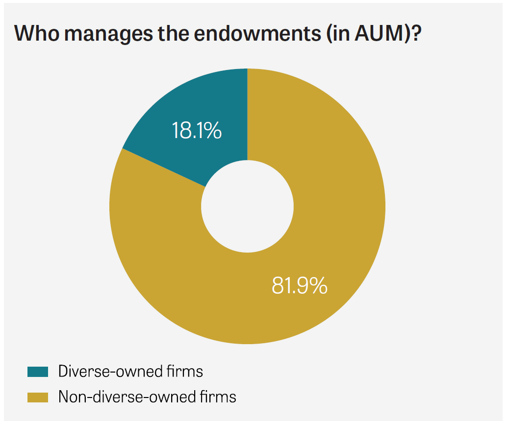 Overall, the data in this year’s study shows continued — but still incremental — progress. Since our last report, we’ve observed that the percentage of foundation endowments managed by diverse owned firms has slightly increased from 16.6% to 18.1%.